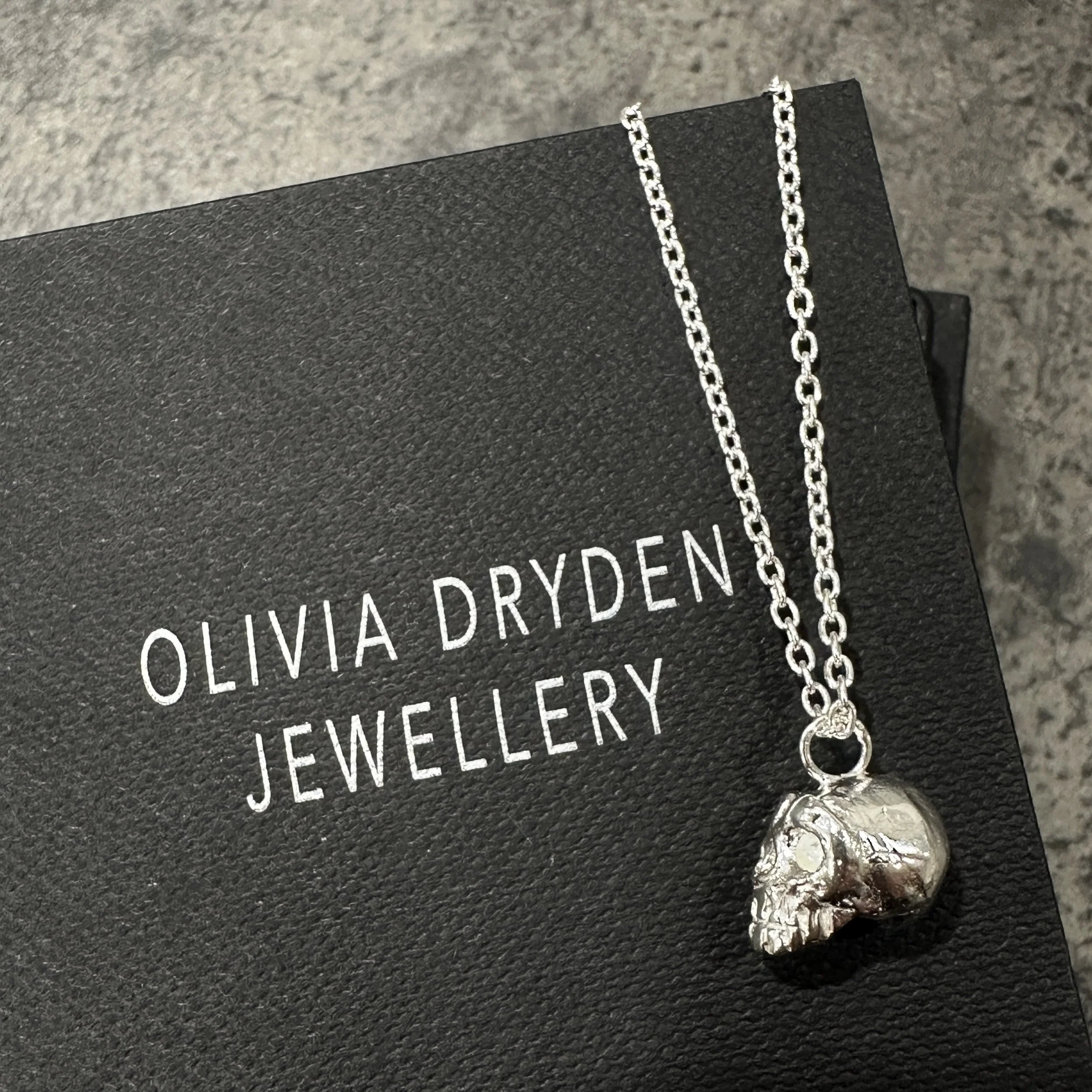 The original Finch Skull was moulded to preserve all the fine details of the skull. The Finch skull hangs from hand-knotted freshwater pearls. Finished off with a handmade hammered clasp with extension chain for altering the length.